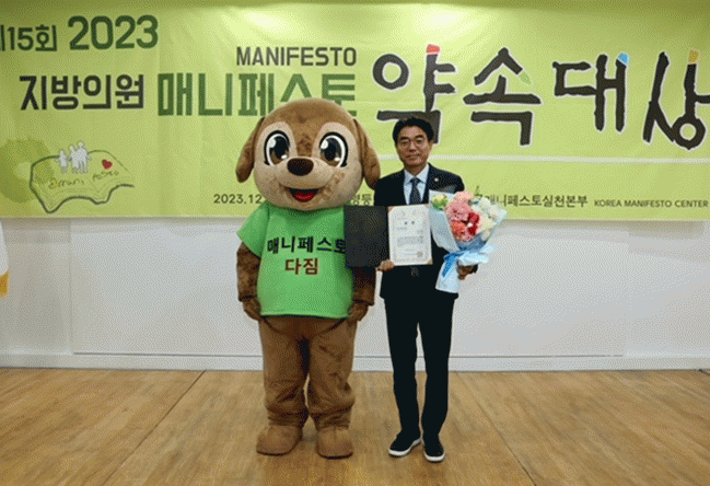 사단법인 한국매니페스토실천본부가 주관하는 ‘매니페스토 약속대상’은 지방의회 역량강화 및 주민 신뢰기반을 구축하기 위해 매년 전국 지방의원을 대상으로 공약이행 분야와 좋은 조례 분야로 나눠 시상한다.