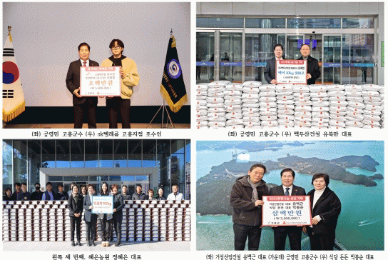 22일 고흥군에 따르면 sk텔레콤 고흥지점 직원(조수인) 300만 원, 법무부 청소년 범죄예방 고흥지구 회장(조광영) 200만 원, 대정이엔씨 200만 원, 백두산건설 백미 10kg 200포(500만 원 상당), 오성건축자재 쿠키·오란다 과자 각 100개(590만 원 상당), 혜은농원 무김치 900kg과 김장용 생무 3톤(700만 원 상당), 거성산업건설과 식당 돈돈 300만 원을 기탁했다고 전했다.