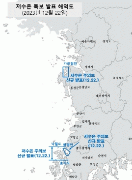 저수온 주의보는 바다 수온 4℃ 도달이 예측되거나, 전일 또는 평년 수온에 비해 2~3℃ 이상 급격히 떨어져 양식생물 관리에 주의가 필요한 해역에 발표된다.