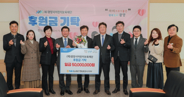 농협은행 광양시지부는 지난 2017년부터 2022년도까지 총 9천만 원을 기탁한 바 있으며, 기탁된 기금은 아이 키우기 좋은 행복도시 광양 만들기에 헌신하고 있는 어린이보육재단 지원과 지역사회 발전, 나눔 문화 확산에 동참이 목적이다.