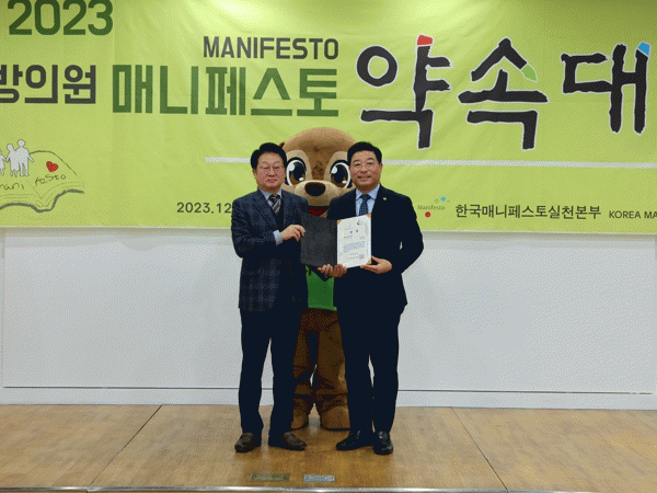 ‘2023 지방의원 매니페스토 약속대상’은 한국매니페스토실천본부가 주최하며 지역발전과 주민들의 복지증진 및 삶의 질 향상을 위해 헌신하고 매니페스토 이행에 충실한 지방의원에게 주는 상으로 ‘공약이행’과 ‘좋은조례’ 2개 분야로 나눠 분야별 전문가 심사를 통해 최종적으로 상을 수여한다.