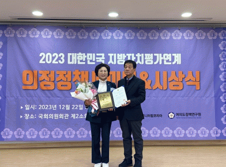 특히 여성정책위원회 위원장으로서 양성평등 실현과 여성정책을 위한 토론회 및 연구활동을 펼쳐오는 등 적극적인 의정활동이 높은 점수를 받은 것으로 전해졌다.