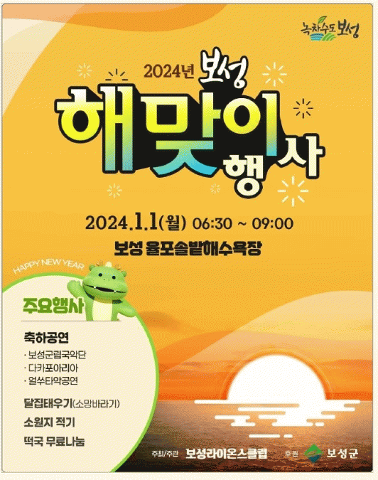 이번 해맞이 행사는 보성라이온스클럽이 주최?주관하며 1월 1일 오전 6시 30분부터 새해를 여는 타악 공연, 국악 공연, 성악 공연을 시작으로 새해 희망 나눔, 달집태우기 행사 등 다채로운 프로그램을 진행할 예정이다.