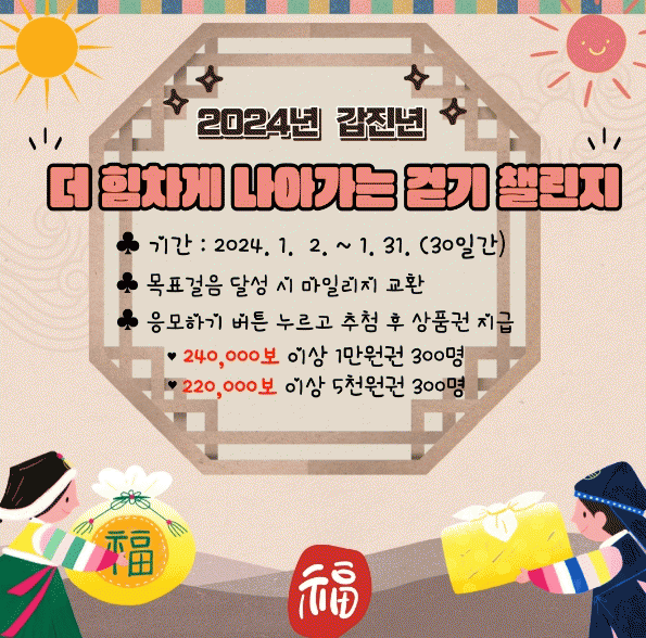 1월 2일부터 31일까지 진행되는 이번 걷기 챌린지는 1걸음 당 1마일리지 적립으로 1일 최대 8천 마일리지가 누적되며 목표 마일리지 달성 시 쿠폰 교환이 가능하다.