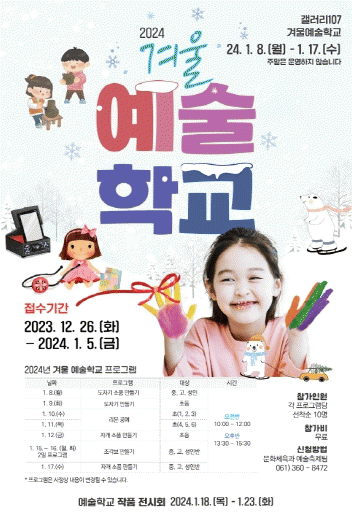 이번 예술학교는 2024년 1월 8일부터 1월 17일까지 곡성읍 중앙로에 위치한 ‘갤러리 107’에서 진행하며, 겨울 방학 동안 지역 청소년과 성인 등 200명을 대상으로 다양한 예술 활동 경험을 제공한다.