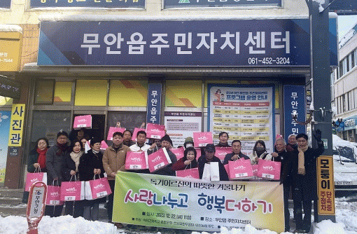 이숙아 무안읍장은 “무안읍을 위해 뜻깊은 봉사활동에 추진해주신 무안읍 주민자치위원회, 생활지원사 선생님들께 깊은 감사를 드린다”며 “무안읍사무소는 한 분도 빠지지 않고 따뜻한 겨울을 보낼 수 있도록 취약계층 발굴에 더욱 힘써 협조하도록 하겠다”고 말했다.