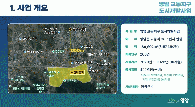 ‘영암 교동지구 도시개발’은 영암실내체육관 맞은편 영암읍 교동리 189,602㎡ 부지에 주거·교육·문화·상업 등 복합 기능을 갖춘 신도심을 세우는 사업. 이 사업은 ‘혁신으로 도약하는 더 큰 영암’ 을 구호로 출범한 민선 8기 영암군의 혁신 도시개발 집약체로 평가받고 있다.