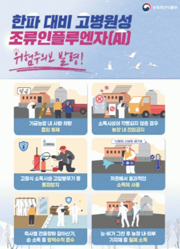 이어 “사육 중인 가금에서 폐사 증가, 산란율 감소 등의 증상이 없더라도 사료 섭취량 감소, 침울, 졸음, 녹변(녹색 설사) 등의 임상증상을 보일 경우에도 즉시 방역당국으로 신고해 달라”고 강조했다.