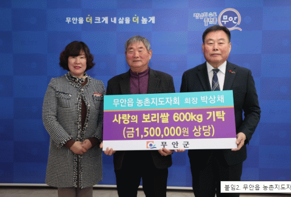 김산 무안군수는 “추운 날씨에 소중한 나눔을 해주신 박상채 회장님 덕분에 마음이 따뜻해진다”며, “군에서도 모든 군민에게 풍년이 깃들 수 있도록 최선을 다하겠다”고 말했다.
