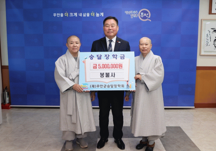 김산 무안군수는 “무안군 교육발전과 인재 육성에 관심 가져주신 대한불교조계종 봉불사에 깊은 감사를 드린다”며 “맡겨주신 소중한 기탁금은 지역 학생들이 미래를 이끌어 갈 훌륭한 인재로 자라나는데 값진 자양분이 될 것이다”고 말했다.