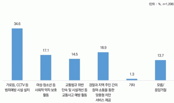 범죄예방의 효과적인 치안 정책은 ‘범죄 예방 시설 설치’(41.4%), ‘어르신 대상 범죄 예방 순찰’(30%), ‘맞춤형 치안 서비스 제공’(20.3%) 순으로 답했다.