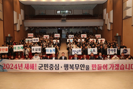 오전 8시 30분 충혼탑 참배를 시작으로 시무식에서 2024년 신년사, 직원 상호 간 새해 인사, 공직자 청렴실천 결의, 군정다짐 퍼포먼스 기념 촬영 등의 순으로 새해 업무를 시작했다.