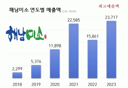 해남군에서 직접 운영하고 있는 해남미소는 지난 2021년 매출 200억원을 처음으로 돌파한데 이어 2022년에는 158억여원으로 매출이 감소했으나, 지난해 다시 237억여원의 최고 매출을 기록했다.