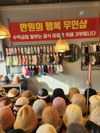 만원의 행복 모자집은 돌산 향일암 앞에 위치한 까페 호이안의 한켠에서 운영되는 무인샵으로 모자, 목도리, 장갑 등을 1만 원에 판매하고 있다.