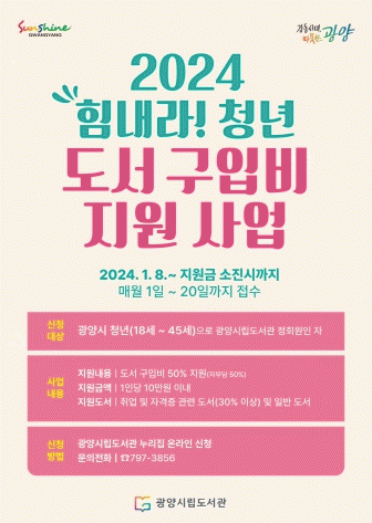 매달 1일~20일까지 광양시립도서관 누리집에서 신청 가능하며, 지원금 소진 시까지 매달 신청을 받는다. 도서는 광양시 인증 지역서점에서 본인부담금(50%) 결제 후 수령하면 된다.