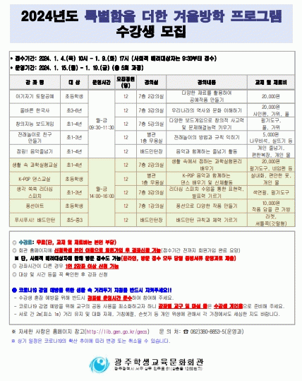 광주학생교육문화회관 김용일 관장은 “청소년들의 창의력과 상상력을 증진 시킬 수 있는 다양하고 알찬 프로그램을 운영하여 문화예술교육의 장을 제공하겠다”며 “긴 겨울방학을 활용해 참여함으로써 아이들이 특별한 일주일을 보낼 수 있기를 바란다”라고 말했다.
