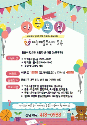이용 대상은 만 6세부터 12세 사이 초등학생 20명으로 현재 선착순 모집 중이며 이용을 원하는 주민은 다함께돌봄센터에 전화 문의하면 된다.