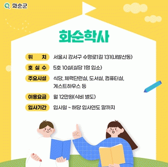 수도권으로 진학하는 화순군 대학생들에게 높은 주거비 부담을 덜어주고 면학 분위기 조성을 위해 마련된 공공기숙사이다.