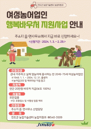 진도군 관계자는 “2024년 행복이용권(바우처) 지원사업으로 많은 여성농어업인들이 문화혜택을 누릴 수 있길 바란다”며 “앞으로도 농어촌지역의 여성농어업인들의 복지와 문화혜택을 위한 다양한 지원사업을 추진해 나가겠다”고 말했다.