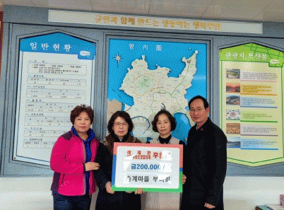 이번 기탁금은 송계마을 부녀회에서 새해 해맞이 행사 떡국 판매로 마련된 수익금으로 마련됐으며, 해마다 수익금을 장학금과 이웃돕기 성금으로 기탁하고 있다.
