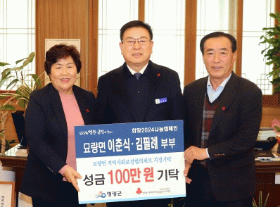 부부는 항상 사회에 환원하자는 마음을 가지고 지역의 어려운 이웃들을 위해 어버이날 안부 살피기, 의류 지원 및 음식 나눔 등 소소한 나눔 활동을 펼치고 있으며, 이번 성금은 묘량면 지역사회보장협의체로 지정 기탁하여 묘량면의 어려운 이웃들에게 지원될 예정이다.