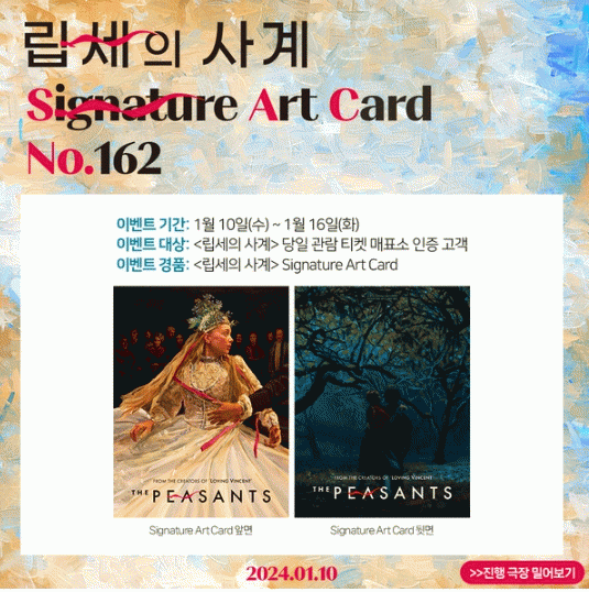 10일(수) 개봉과 함께 시작되는 영화 '립세의 사계'의 개봉주 현장 증정 이벤트는 당일 영화 관람 티켓을 매표소에서 인증한 관객에게 선착순으로 시그니처 아트카드를 증정하는 이벤트로, 1월 10일(수)부터 1월 16일(화)까지 진행될 예정이다.
