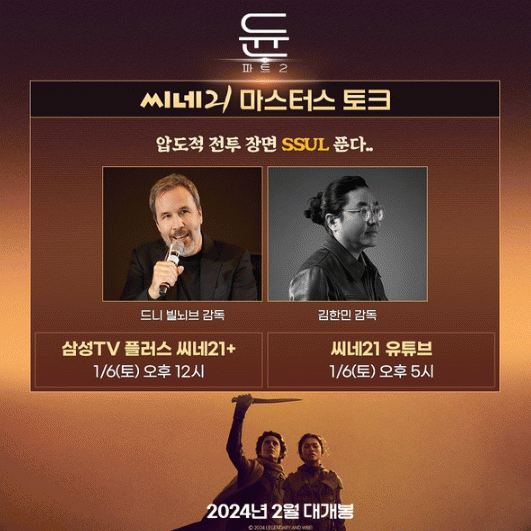 특히 2월 개봉을 앞둔 '듄: 파트2'에 대한 관객들의 기대가 점점 커지고 있는 현 시점, [씨네21+] 마스터스 토크를 통해 공개될 '듄: 파트2'에 대한 연출 비하인드는 개봉만을 기다리고 있는 예비 관객들의 기대감을 한층 더 증폭시킬 것이다.