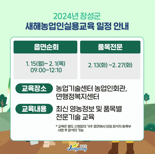 교육은 ‘읍면 순회교육’과 ‘품목별 전문 기술교육’으로 나뉜다. 먼저 ‘읍면 순회교육’은 오는 15일 장성읍에서 시작해 2월 1일까지 지역별로 실시한다.