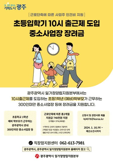 광주시 일가정 양립 지원정책인 ‘초등1학년 학부모 10시 출근제 도입 중소사업장 장려금 지원 사업’은 300인 미만 중소사업장에서 근무하는 초등 1학년 학부모 근로자가 입학기(3~7월)에 최대 2개월간 출근시간을 1시간 늦출 수 있도록 지원하는 사업이다.