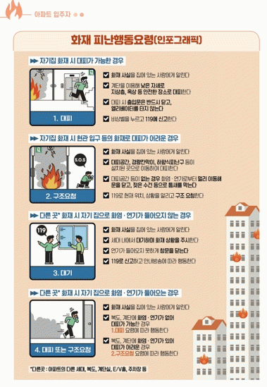 전남도는 ‘아파트 화재시 피난 행동요령’을 그림 정보(인포그래픽), 동영상, 안내방송문 등 다양한 콘텐츠를 활용해 홍보할 계획이다.