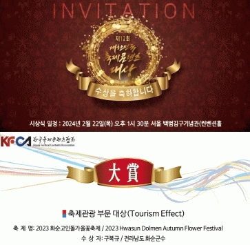 화순군은 유네스코 세계문화유산인 고인돌 공원에 가을꽃(국화, 코스모스, 해바라기) 축제를 개최함으로써 관광 시너지 효과를 발휘한 점을 인정받아 축제 관광 부문 대상에 선정됐다.