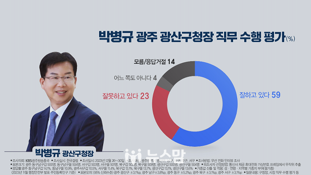 KBS광주방송총국이 한국갤럽에 의뢰한 2023년 12월 26~28일 삼일간 진행한 광주 5개 구청장 직무수행 평가 결과 초선의 박병규 광산구청장에 대해서는 잘하고 있다는 응답이 59%, 잘못하고 있다는 응답이 23%로 집계됐다.