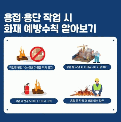 소방서에서 당부하는 공사장 화재 예방법은 용접 작업 전 공사장 기준에 맞는 임시소방시설 설치, 용접 등 화재 취급 작업 시 화재감시자 지정 배치, 용접ㆍ용단 작업자로부터 반경 5m 이내 소화기 비치, 작업장 주변 반경 10m 이내 가연물 적치 금지, 용접 작업 후 작업장 주변 불씨 여부 확인 등이다.