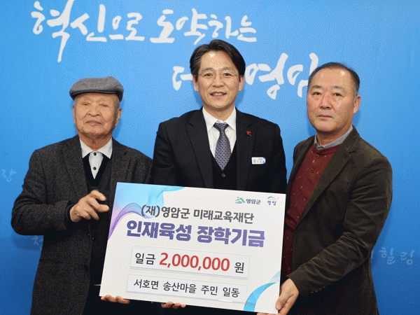 9일 송산마을 주민들은 (재)영암군미래교육재단에 지역인재 육성에 써달라며 200만원을 기탁했다.