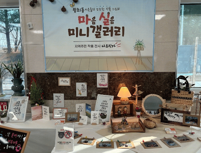 마실 미니갤러리는 주민들의 소소한 작품 전시 공간으로 ▲ 2023년 저소득층 문화프로그램으로 시행된 캘리그라피, 라탄공예 ▲ 지역아동센터 아동의 3D펜 프린팅 작품 ▲ 동사무소 직원들의 동아리(솟대 만들기) 작품이 전시되어 있다. 지역주민과 지역아동센터 아동, 동 직원들의 협력 전시회로 의미를 더하고 있다.