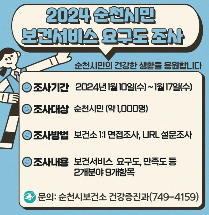 참여 방법은 순천시 홈페이지, SNS (페이스북, 블로그, 카카오채널, 인스타 등)를 통해 온라인으로 할 수 있으며, 보건소, 신대 및 연향 건강생활지원센터 민원실에 방문하면 직원이 직접 대면 설문조사를 진행한다.