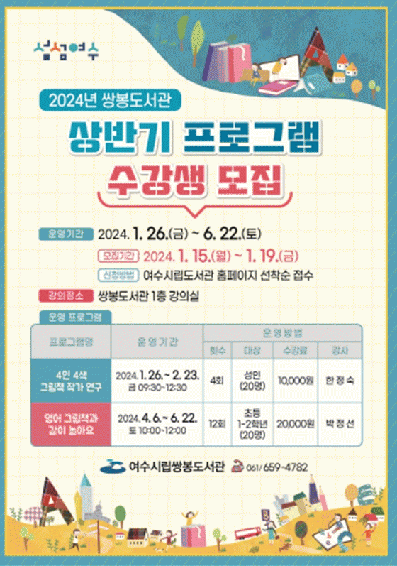 수강료는 강좌별로 유료이며, 참여 신청은 오는 15일부터 여수시립도서관 홈페이지에서 선착순으로 접수된다.