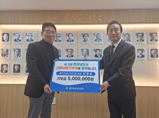 전라남도는 재충남호남향우회 연합회와 강윤성 광주전남시도민회장이 고향사랑기부금 500만 원씩을 기탁했다고 밝혔다.