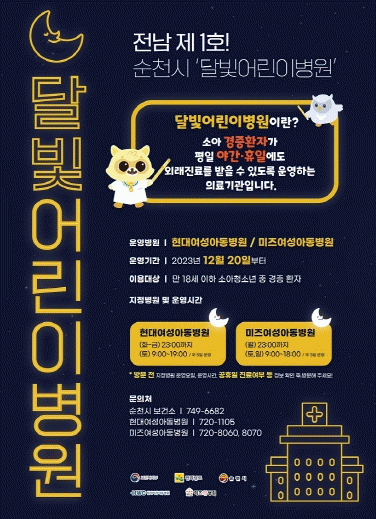 한편, 달빛어린이병원은 보건복지부가 야간 또는 휴일에 소아경증환자에게 외래 진료를 통해 신속한 의료서비스를 제공하기 위해 도입된 제도로 전남에서 유일하게 순천시에 두 개의 병원이 운영되고 있다.
