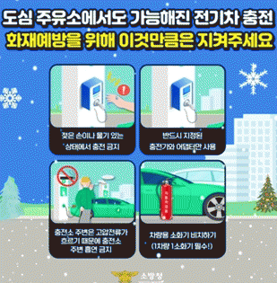 소방서는 전기자동차 화재 예방 수칙으로 ▲충전소 주변 흡연 금지 ▲반드시 지정된 충전기와 어댑터 사용하기 ▲젖은 손이나 물기가 있는 상태에서 충전 금지 ▲차량용 소화기 비치하기 등을 지켜 달라고 당부했다.