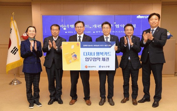 광주광역시는 12일 시청 비즈니스룸에서 ㈜광주은행과 다자녀가정 우대를 위한 ‘다자녀행복카드’(기존 ‘아이사랑카드’) 혜택 확대·개편 업무협약을 체결했다.