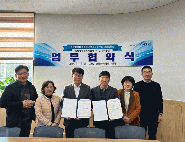 별량면 행정복지센터는 지난 11일, 첨산 둘레길 이용객 편의를 위해 ㈜우리종건(대표 이창민)과 건물 내 화장실을 개방한다는 업무 협약을 체결했다고 밝혔다.