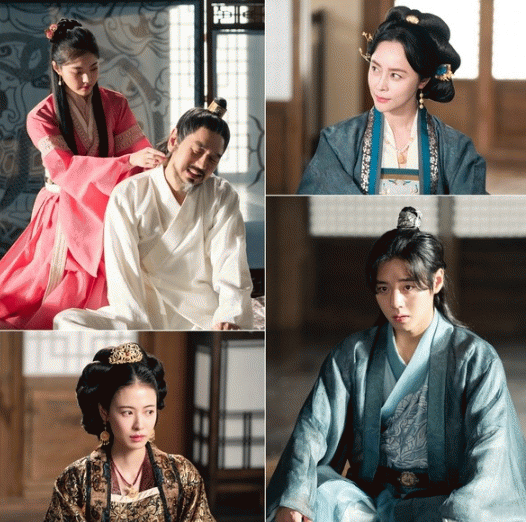 오늘 15일(월) 공개된 스틸에는 사조 현과 연월, 금화, 아사태국의 왕 사조 승과 그의 후궁 청명비(우희진 분)의 모습이 담겨 있다.