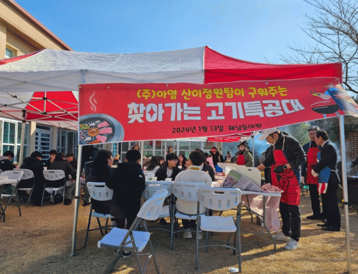 6회차를 맞아 이번 ‘찾아가는 고기특공대’는 해남군의 보육시설인 등대원을 찾아 원생들과 함께하는 자리를 마련했다. 특히 해남 솔라시도에서 산이정원을 조성 중인 ㈜아영 산이정원팀 직원들과 지역 국회의원 및 예비후보자, 해남군의회 민홍일·민경매·이기우 의원 등이 참여하여 봉사활동에 힘을 실어주었다.