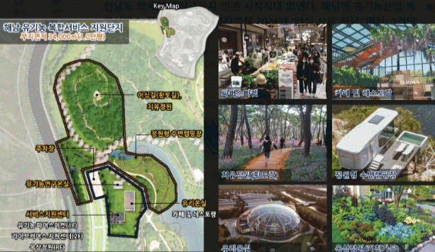 해남 산이면 일원에 기반 시설을 포함해 유기 친환경 전문판매장, 자연치유 레스토랑·카페, 종합커뮤니티센터, 가정간편식(HMR)·밀키트 등 가공·판매시설과 유기 친환경 메타버스 전용관, 어린이 자연치유 놀이터·유기식품공방, 체험농장 등 교육·홍보·체험시설과 유기농 치유 및 생태공원 시설 등이 들어설 예정이다.