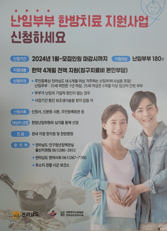 지원 대상은 화순군에 6개월 이상 주민등록을 둔 가정 또는 사실혼 중 35세 미만 1년 이상, 35세 이상 6개월 이상 임신이 안 되는 난임부부로 소득 기준과 상관없이 누구나 신청할 수 있다.