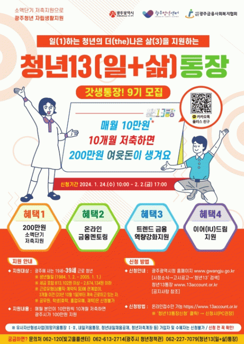 신청을 희망하는 청년은 오는 24일부터 다음달 2일까지 청년13(일+삶)통장 누리집을 통해 온라인 신청하면 된다.