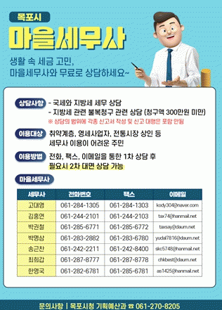 기타 마을세무사에 대한 자세한 내용은 시 홈페이지를 참고하거나, 목포시청 기획예산과로 문의하면 된다.