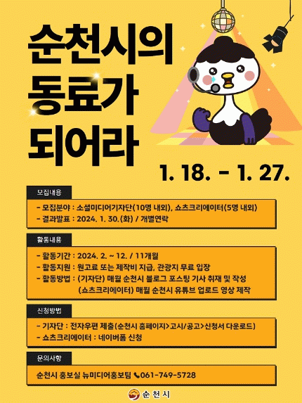 시민 크리에이터는 2월 1일부터 12월 31일까지 매월 시정소식, 축제, 관광지·맛집, K-디즈니 순천 등 자유로운 홍보콘텐츠를 발굴하여 시민의 눈으로 보는 다양한 순천의 모습을 시 공식 SNS를 통해 홍보하는 역할을 맡게 된다.