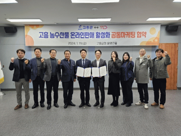 협약식은 조대정 고흥 부군수를 비롯해 조광일 영업기획상무 등 관계 임직원들이 참여해 고흥군 농수특산물의 온라인 판로 확대를 위한 마케팅 지원에 상호 협력하기로 했다.